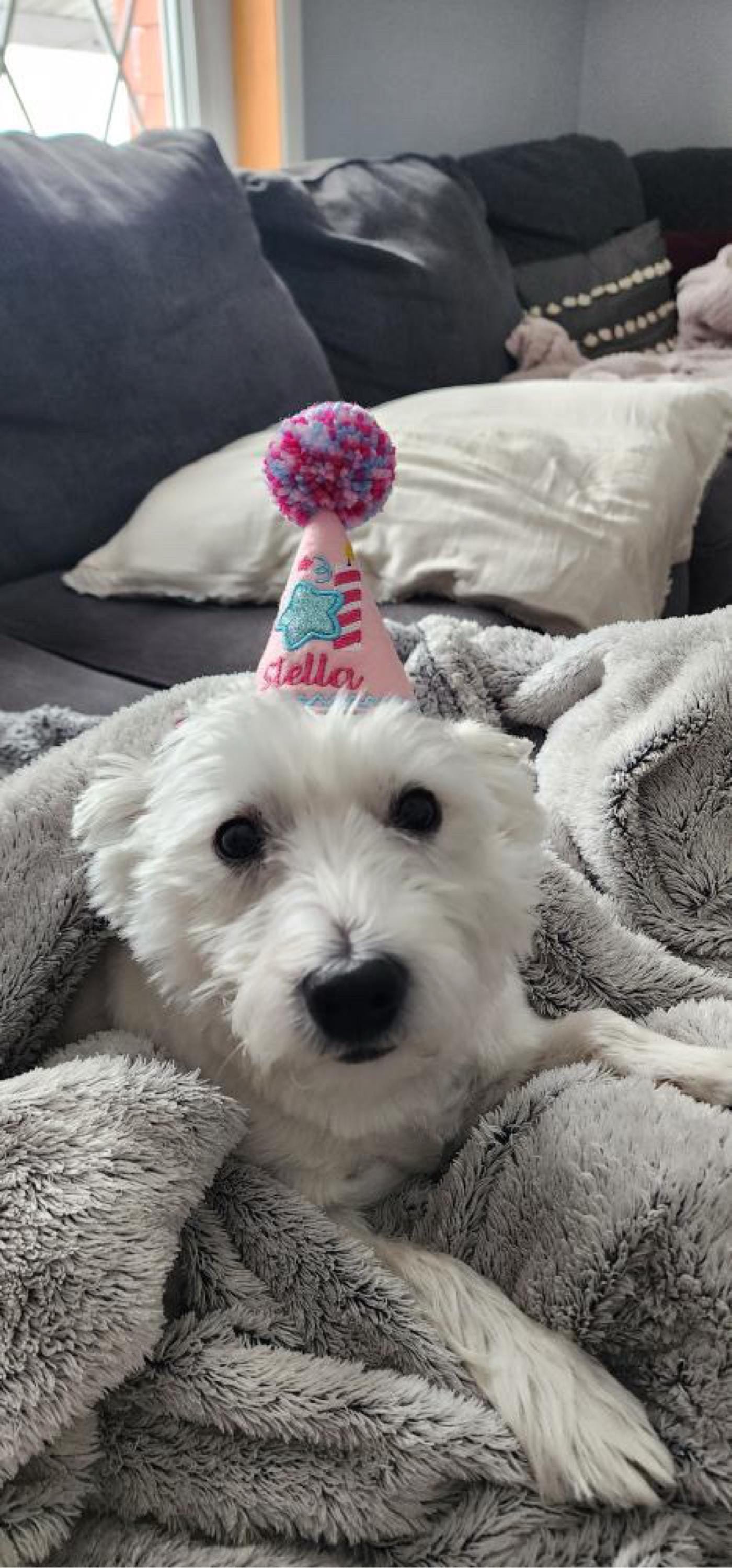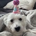 dog birthday hat design features a fun birthday candle, confetti and