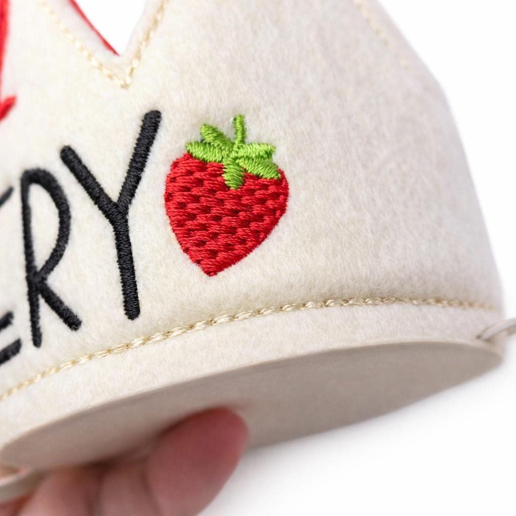 features embroidered strawberries on each