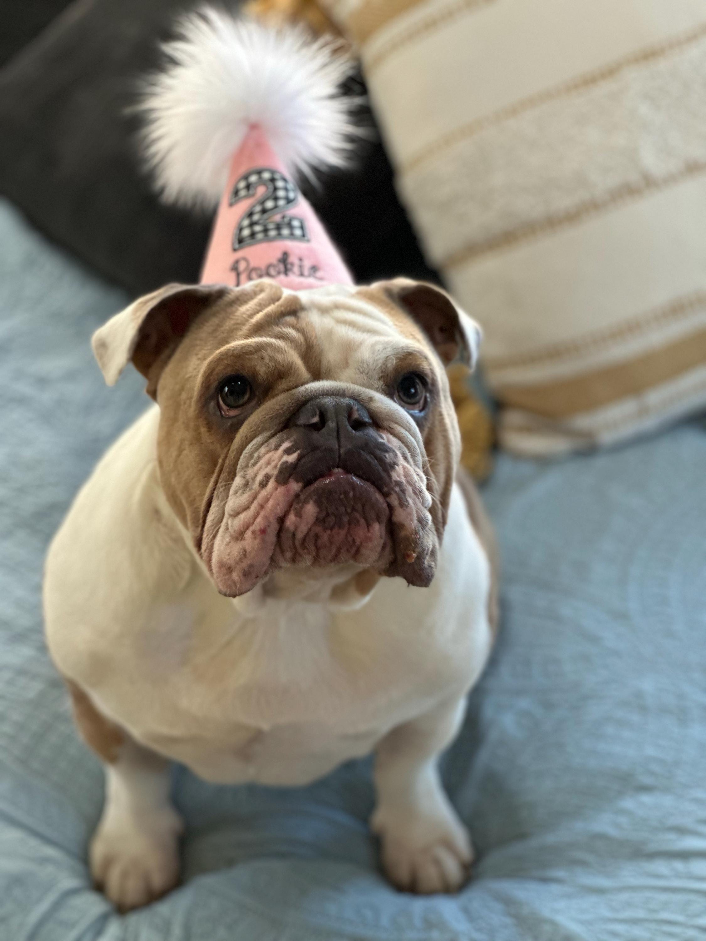 Adorable vintage inspired dog birthday hat in light pink with a pretty